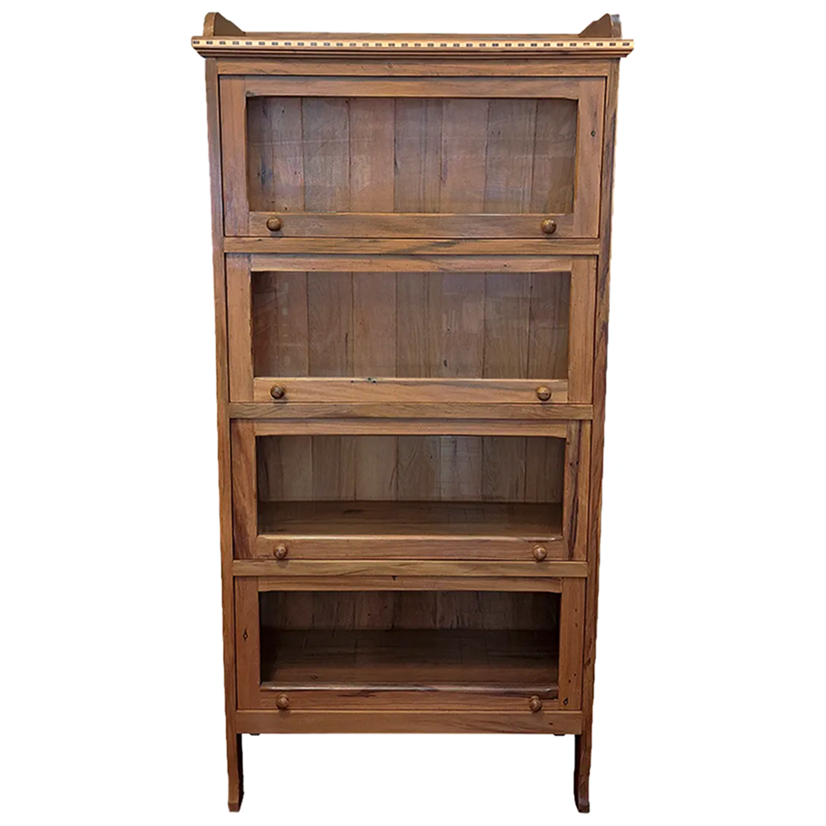Livreiro de madeira maciça peroba rosa antiga, com marchetaria na parte superior, 4 portas retráteis com vidros, estilo Mielle. É uma peça funcional, adaptável a diversos ambientes.